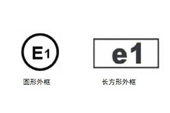 圓形外框:指在車輛停止和行使狀態下,必須使用的產品。例如:輪胎、車燈、后視鏡、擋風玻璃、安全帶等等。而外框內的數字1,2,3,4····,代表頒發該e-Mark證書的各個不同歐盟成員國家之代號。該代號所示表示是該國家的交通部簽發的e-Mark證書。