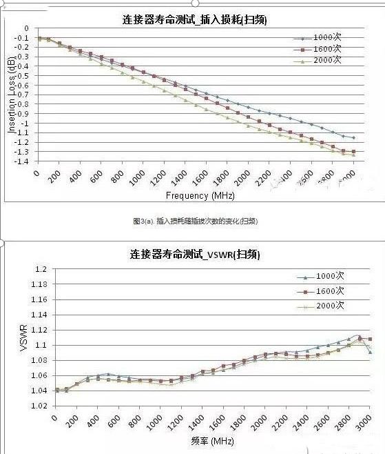 圖3是掃頻條件下的插入損耗和駐波變化,分別記錄了在插拔1000次,1600次和2000次情況下從10MHz-3GHz的指標(biāo)。掃頻結(jié)果顯示在整個工作頻段內(nèi),其插入損耗和駐波的變化特征與點頻是一致的。