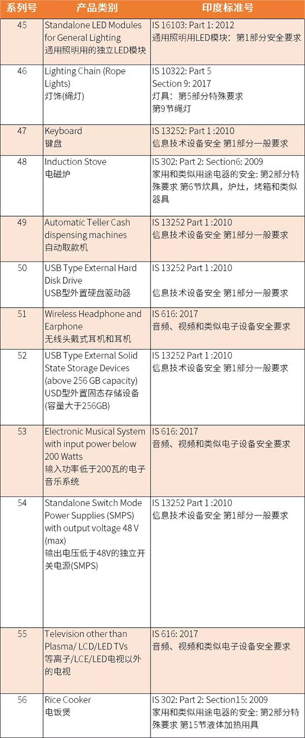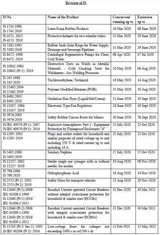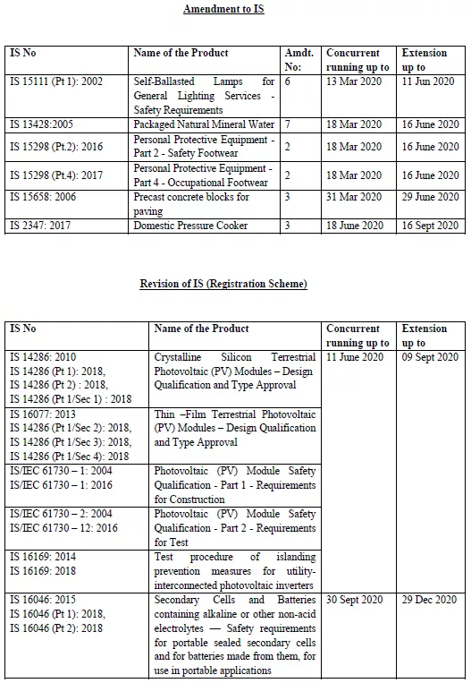 另外,印度中央標準局于2020年3月27日發布通知,由于受疫情影響, 將推后原本將于2020年3月1日及之后強制執行的新版IS標準,由原定執行日期起推遲90天,詳情如下:
