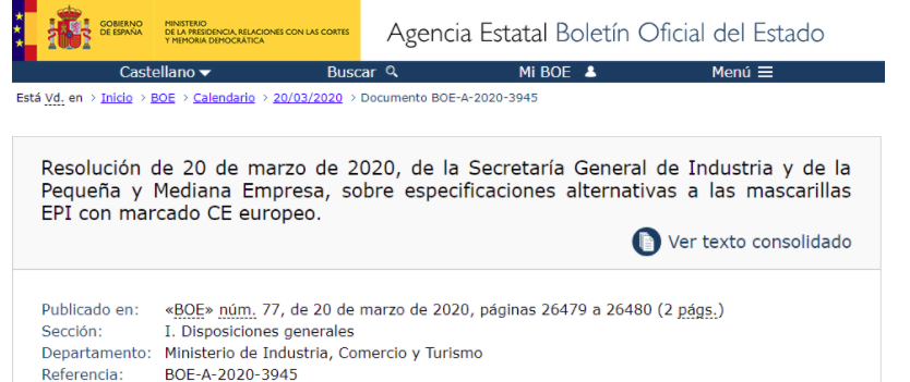針對新冠肺炎疫情期間帶CE標(biāo)識(shí)的個(gè)人防護(hù)用品市場短缺的現(xiàn)狀,近日,西班牙工業(yè)和中小企業(yè)部發(fā)布決議,公布中國口罩相關(guān)標(biāo)準(zhǔn)可替代歐洲標(biāo)準(zhǔn)。