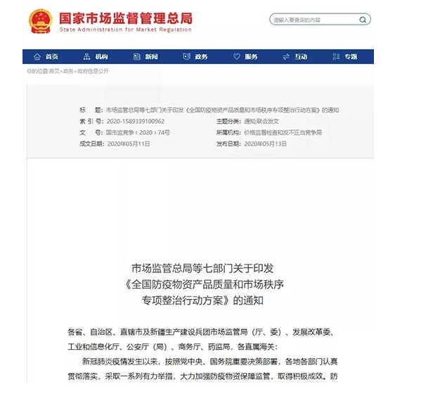 近日,為加強對防疫物資產品的質量監管,維護市場秩序,市場監管總局、國家發展改革委、工業和信息化部、公安部、商務部、海關總署、藥監局七部門聯合開展全國防疫物資產品質量和市場秩序專項整治行動。于2020年05月13日,印發了《全國防疫物資產品質量和市場秩序專項整治行動方案》的通知。