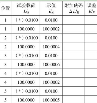 2.按照規程中偏載誤差的4個區域檢定偏載誤差。本例題中放上100g標準砝碼分別檢定4個區域和中間的偏載誤差。