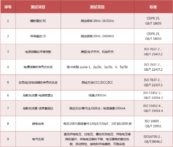 汽車電子產品的主要EMC檢測項目和標準包括:輻射發射和傳導發射(CISPR 25);傳導瞬變發射(ISO 7637—2);輻射抗擾度、傳導抗擾度(ISO 11452系列標準);靜電放電抗擾度(ISO 10605);傳導瞬態抗擾度(ISO 7637系列標準)等。