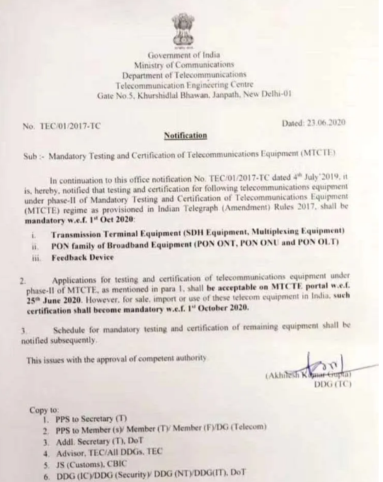 2020年6月中旬,印度電信工程中心(TEC)再次修訂了有關電信設備強制性測試和認證(MTCTE)程序,此次修訂放松了MTCTE程序中認證產(chǎn)品標簽的要求。根據(jù)公告內(nèi)容,加貼標簽的強制要求可以延期至2021年4月1日,即從2020年10月1日算起,過渡期6個月。