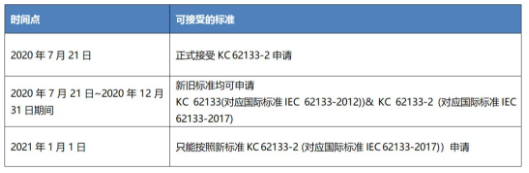 2020年7月21日,韓國技術標準局KATS(Korean Agency for Technology and Standards)發布新通知:KC 62133-2 正式確認并開始使用。其對應的國際標準IEC 62133-2012版和IEC 62133-2017版的CB報告及證書在2020年12月31前均可以被接受用于KC轉證。具體時間點: