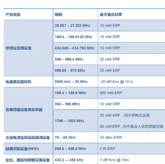 近期,摩洛哥國(guó)家電信管理局(ANRT)發(fā)布了一項(xiàng)新的短距離無(wú)線通信設(shè)備(SRD)規(guī)定ANRT/DG/N°07/2020。新規(guī)定為SRD設(shè)備的各種使用場(chǎng)景提供了額外的頻段,例如大功率射頻識(shí)別,其他技術(shù)要求保持不變。新增的頻段及其最大輸出功率限制如下: