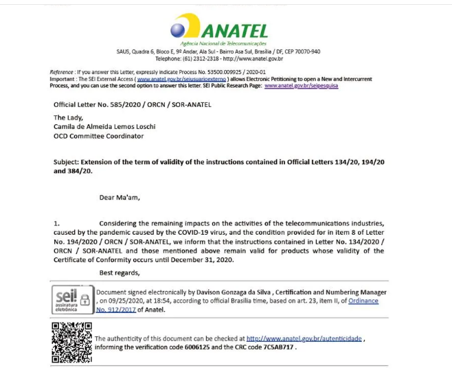 2020年9月27日,巴西國家通訊管理局(ANATEL)發布了官方通函NO.585/2020。該函表示因受新冠肺炎COVID-19的持續影響,ANATEL決定延長執行134/20、194/20和384/20號通函中提及的證書更新的簡化流程。