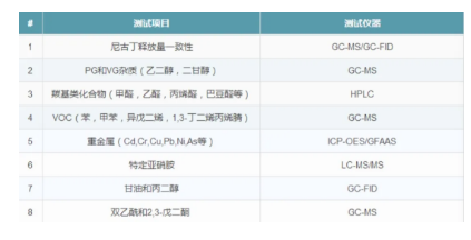 針對電子煙釋放物(Emission)有害成分分析,采用客戶廣泛接受的國際標準,率先開發出了一整套完善的測試方案,可為客戶提供以下測試服務: