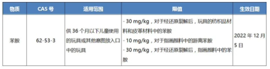2021年6月4日,歐盟委員會(huì)批準(zhǔn)指令(EU) 2021/903,修訂玩具安全指令2009/48/EC,將苯胺新增至玩具安全指令2009/48/EC附件II附錄C中,限制供36個(gè)月以下兒童使用的玩具或其他意圖放入口中的玩具中苯胺的使用,該要求將從2022年12月5日起正式實(shí)施。