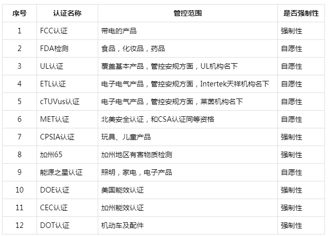對(duì)于常見(jiàn)產(chǎn)品出口美國(guó)所需的認(rèn)證大概有這12類: