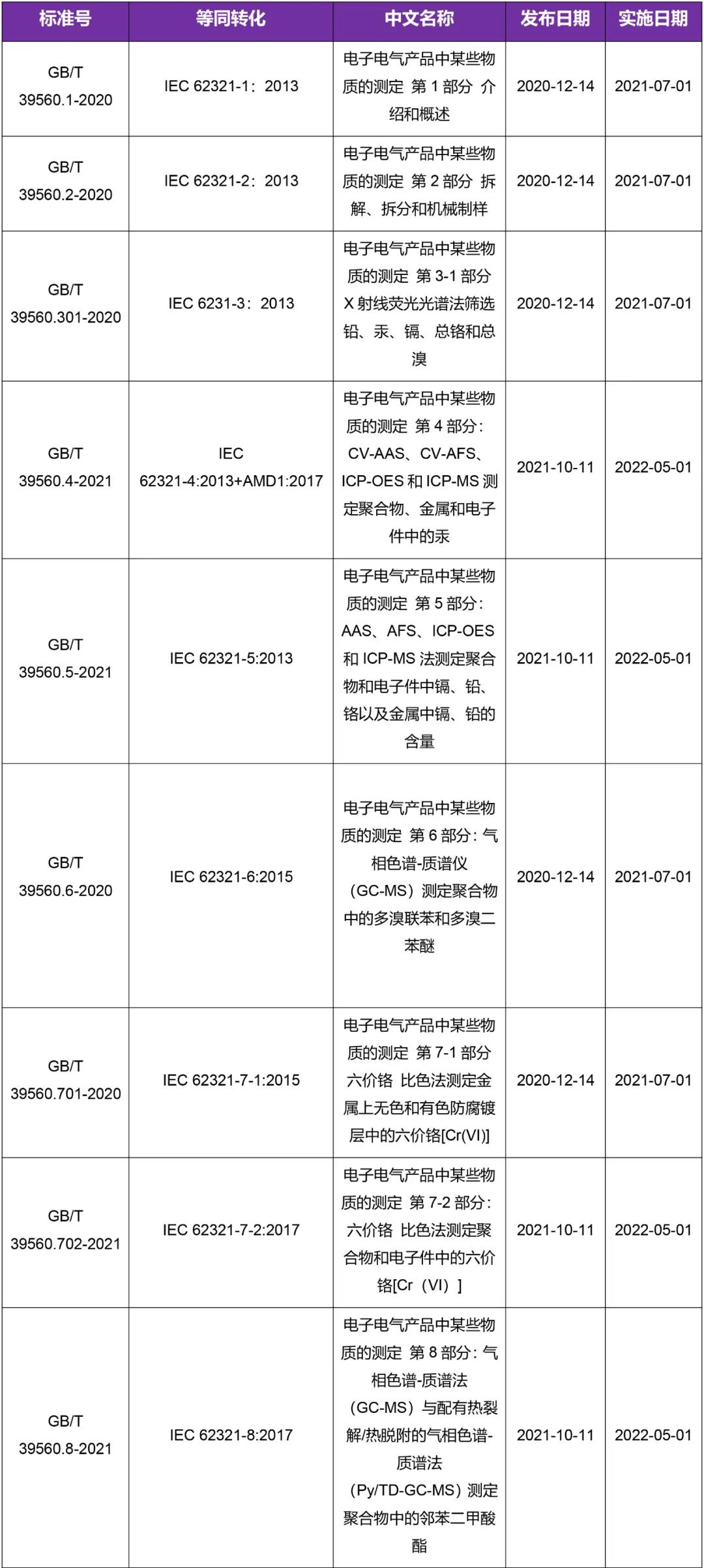 隨著電子電氣領(lǐng)域環(huán)保法規(guī)的加強,更多有害物質(zhì)種類被限制使用,同時也出現(xiàn)更先進快速的新型檢測技術(shù),而目前國內(nèi)電子電氣產(chǎn)品RoHS檢測標(biāo)準(zhǔn)GB/T 26125:2011是等同采用IEC62321:2008(此標(biāo)準(zhǔn)已經(jīng)按檢測技術(shù)和限制物質(zhì)種類修訂并發(fā)布了9個系列標(biāo)準(zhǔn))。因此,GB/T 39560系列標(biāo)準(zhǔn)應(yīng)運而生,有望替代GB/T 26125成為我國《電器電子產(chǎn)品有害物質(zhì)使用管理辦法》配套使用標(biāo)準(zhǔn)!