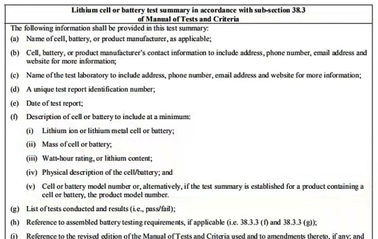關(guān)于鋰電池檢測的第38.3章節(jié)的部分內(nèi)容修訂有兩處: "i驗(yàn)概要Lithium cell and battery testsummary" 中: 38.3.5()(i)原"質(zhì)量(Mass) "更改為“電池或電池組質(zhì)量(Mass of cell orbattery) ";