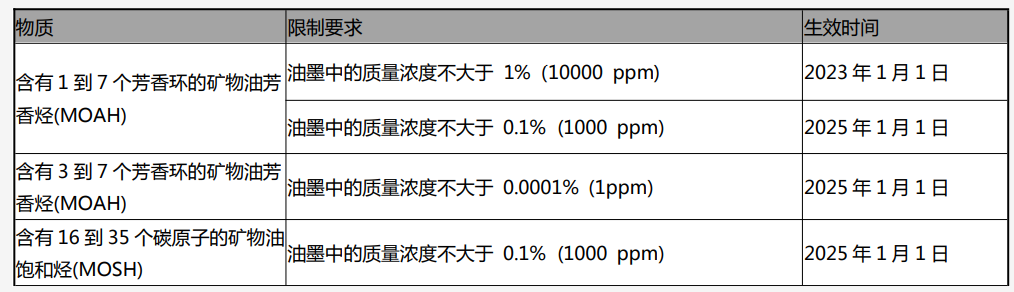 (2)在每個截止日期前制造或進口的紙質包裝和印刷品,如果符合在這些截止日期之前的含量要求,將有自這些截止日期起12個月的庫存處理期。就本法令而言,礦物油是指從用于制造油墨的石油烴衍生的原料生產的油。礦物油作為復雜的碳氫化合物,主要包括直鏈、支鏈烷烴和烷基取代的環烷烴(MOSH)以及烷基取代的芳香烴(MOAH)兩大類。通過飲食攝入人體內的礦物油易在人體內發生集聚,給人體健康帶來巨大的損害。2017年10月27日,世界衛生組織國際癌癥研究機構公布的致癌物清單中,將未經處理或輕度處理的礦物油列入1類致癌物清單,礦物油、高精煉油在3類致癌物清單